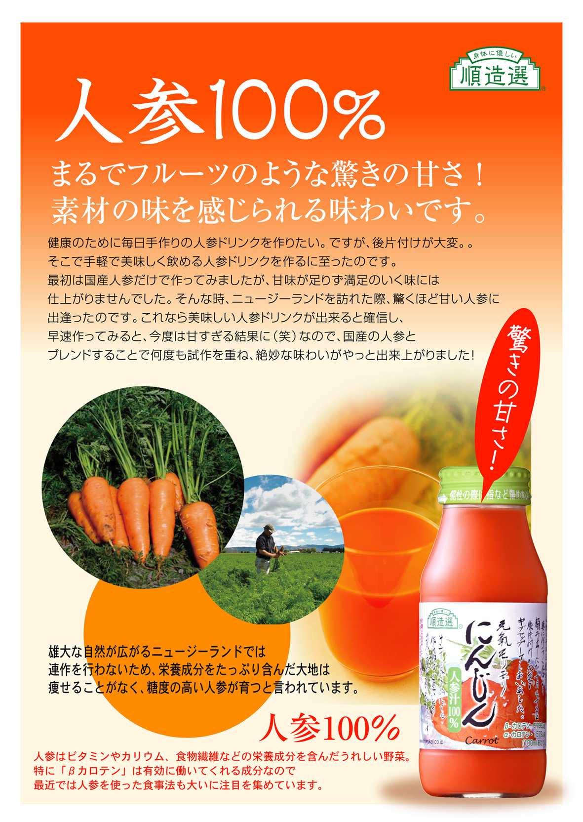 ところが、ニュージーランド産(シャトネー)という品種を使用したところ、甘い人参ジュースが出来上り、人参だけで他の野菜や果物は入れない100%の人参ジュースに仕上がりました。